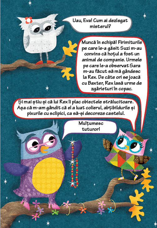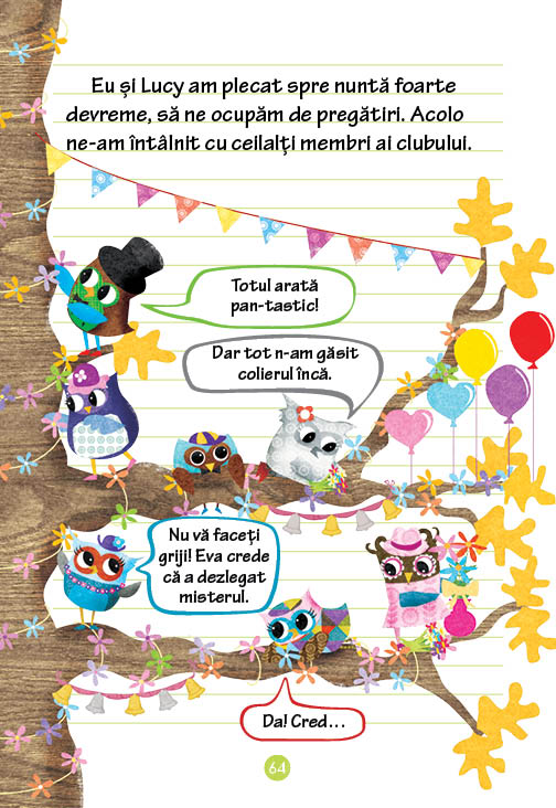 Auzind aceasta, bufnițucile din clasa ei organizează Clubul Secret al Organizatorilor de Nunți, venind care mai de care cu sfaturi și idei despre cum să facă nunta domnișoarei învățătoare un eveniment de neuitat. Dar, în febra pregătirilor, iată că se întâmplă și un necaz: viitoarei mirese îi dispare un colierul pe care voia să-l poarte în ziua nunții, un cadou special de la bunica ei. Astfel, clubul bufnițucilor se transformă, pe loc, în Clubul Secret al Organizatorilor de Nunți ȘI al Detectivilor, iar simpaticele personaje pornesc în căutarea colierului dispărut. Cine să-l fi luat? Să fi fost colega lor, Suzi Gheroanță, care le-a spus că ei oricum nu-i plac nunțile? Sau să fi fost Generalul Sâsâilă, șerpișorul-animal de companie al lui George?